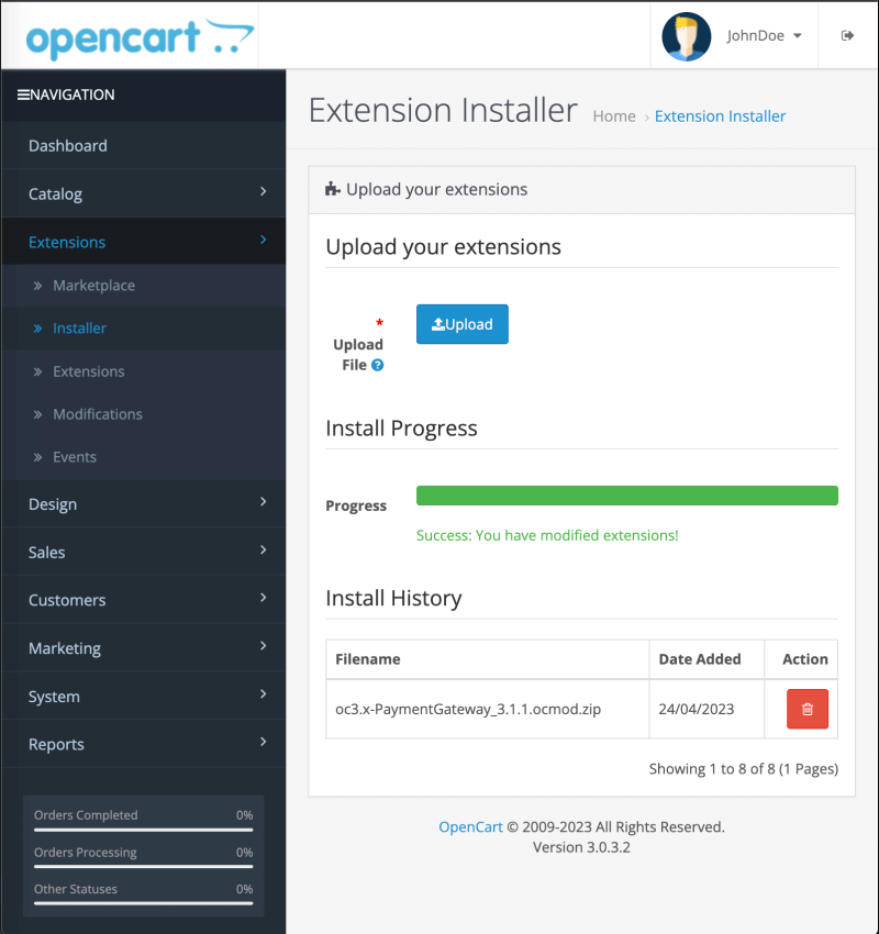 - In the side menu select Extensions > Extensions. In the Choose the extension type select Payments. The page will look as follows.