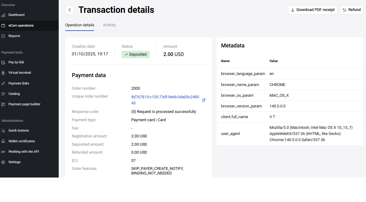 From your Personal Area you can issue full or partial refunds on orders paid by customers (when the order status is Deposited). For two-phase payments, the Deposited status means that the funds held on the payer's card have already been debited.