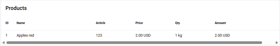 Column Description Name The name of the line item. Article Alphanumeric ID of a line item (vendor ID). Price Price of one product unit. Qty The quantity of the line item. Amount The total amount for specified line item (calculated automatically). Refund Qty The number of items to be returned. Refund amount The amount to be refunded. The field is calculated automatically. In Refund Qty field, indicate the number of items for which the refund should be issued. The resulting amount will be populated in the Refund amount field.