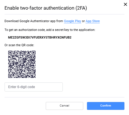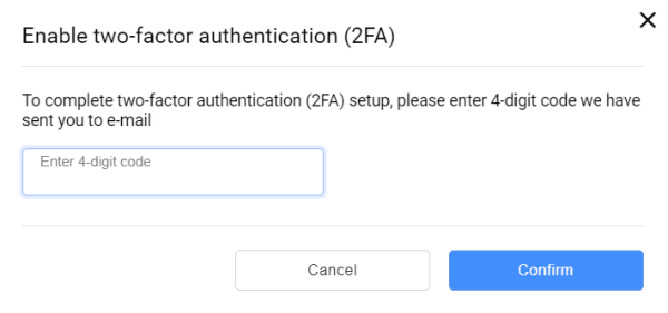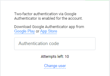 You can set up two-factor authentication to provide additional level of security that guarantees that only you can have access to your Personal Area. In this case, at the logon to the Personal Area, you should enter not only login and password, but also the authentication code generated by Google Authenticator application or sent to your e-mail address (depending on the authentication method configured).