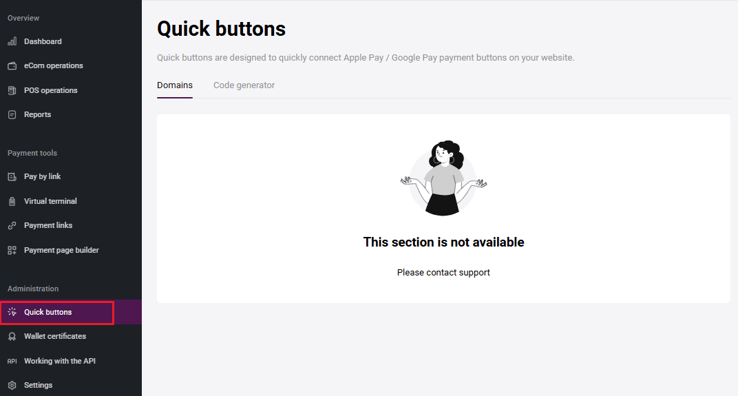 The Quick buttons section provides a quick way to connect Apple Pay / Google Pay payment buttons on your website. To access the Quick buttons section, click