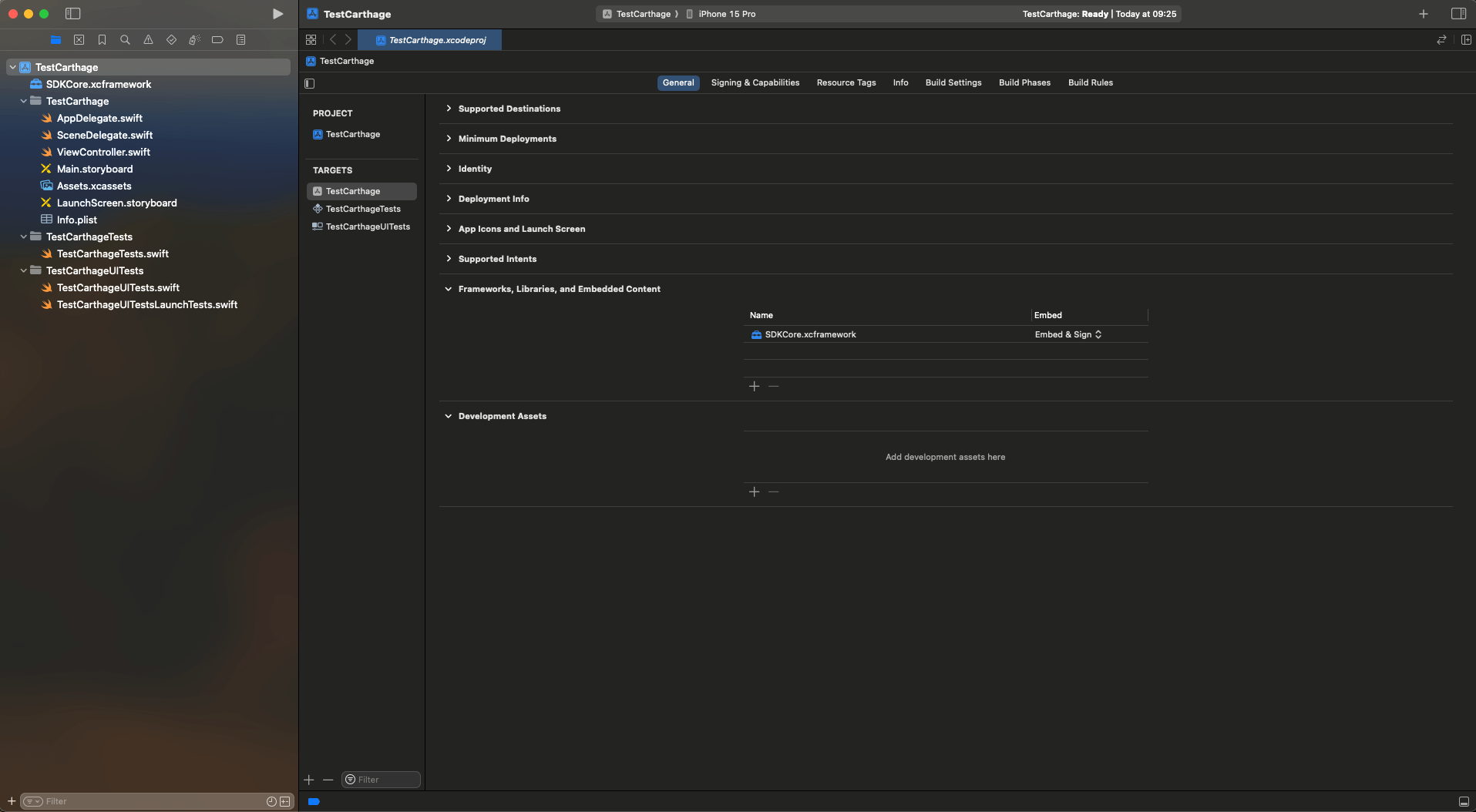 SDKCore.xcframeworkframework the Embed column has Embed & Sign selected.-