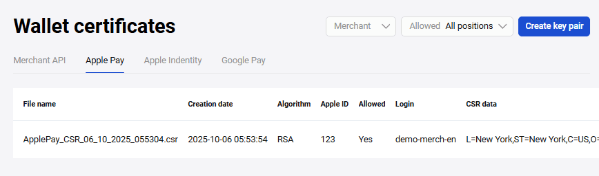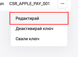 Създадената двойка ключове ще се показва в раздел Apple Pay (вж. фигурата по-долу).