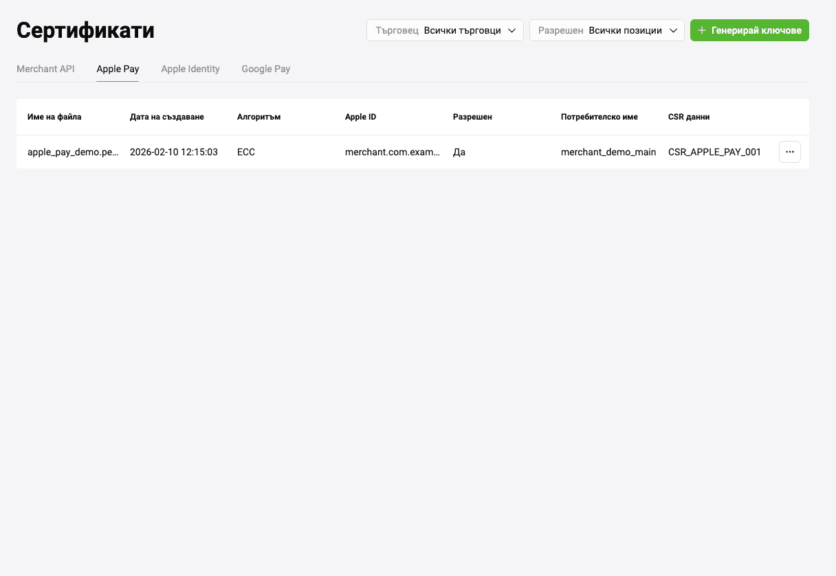 раздел Сертификати в лявото странично меню. - Изберете Apple Pay.