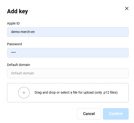 - Apple ID - Посочете Merchant Apple ID.
