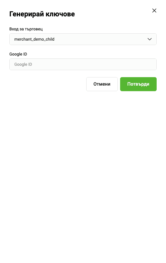 - В полето Google ID посочете вашия идентификатор Google Merchant ID, получен по време на интеграция с Google API, а след това натиснете Потвърждаване.