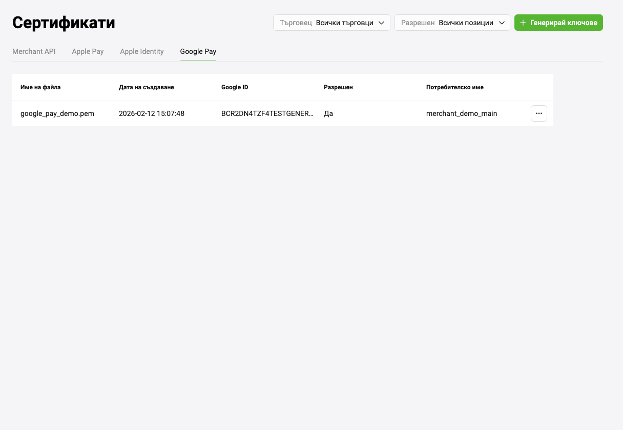 раздел Сертификати в лявото странично меню. - Избор на плащане Google Pay.