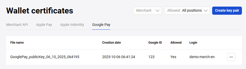 - Създадената двойка ключове ще се показва в раздел Google Pay (вж. фигурата по-долу).