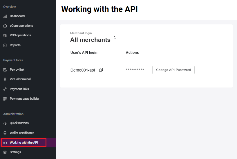 С помощта на API можете да създавате уникални платежни интеграции. Например, да свържете плащане със специално създадена платежна страница. Допълнителна информация за API е достъпна тук. При създаването на Търговец получавате писмо с логин и еднократна парола. След това можете самостоятелно да генерирате парола за API на страницата Работа с API на портала на продавача.