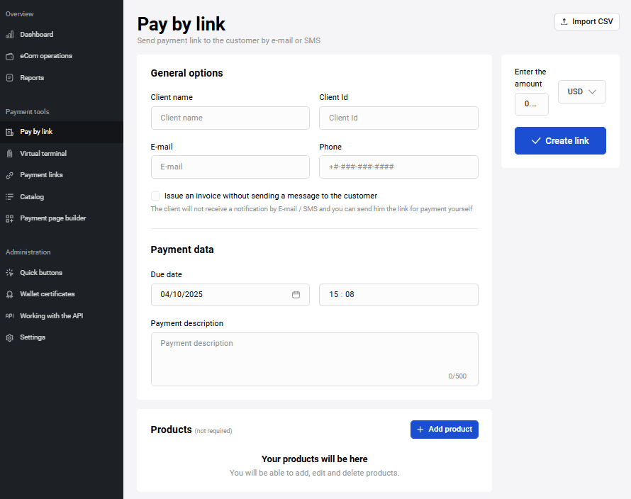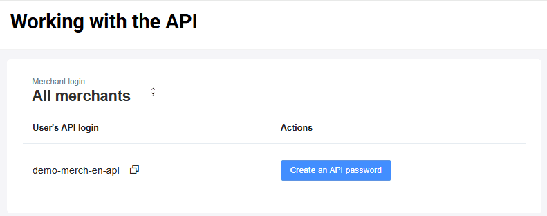 Merchants can create a payment flow as needed. For example, design own fully customized payment page. See more information about API by the link . When you create a Merchant, you receive an email with a login and a one-time password. After that you can generate API password by yourself on the Working with API page in Merchant Portal.