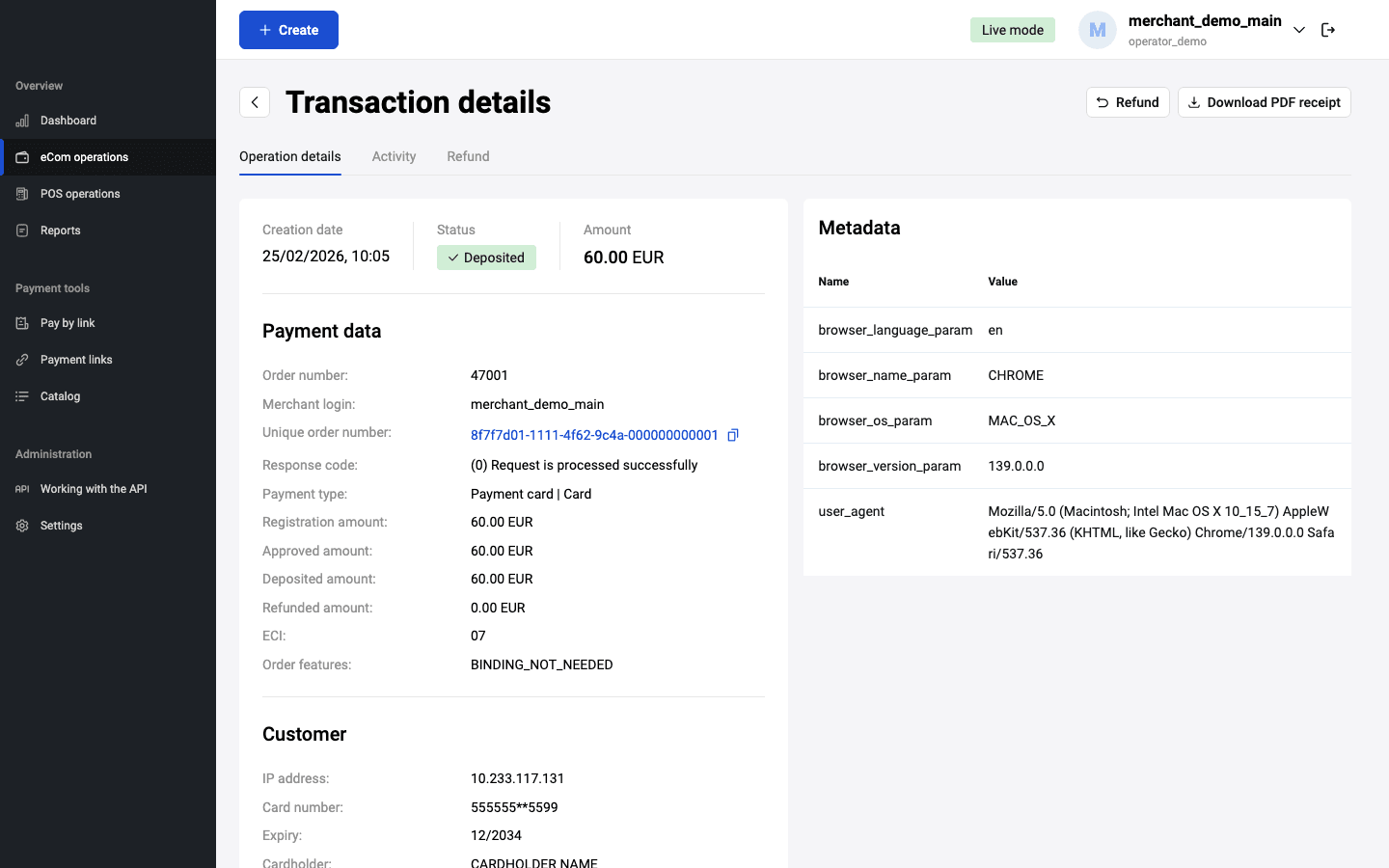 От личния кабинет може да се извърши възстановяване на средства по извършените транзакции (платени от клиентите поръчки, които са в статус Завършена). За двустадийните плащания статус Завършена означава, че средствата, намиращи се на картата на платеца, вече са списани.