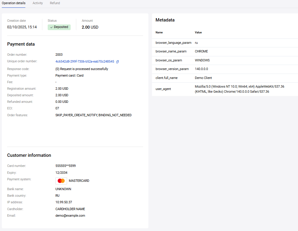 From your Personal Area you can issue full or partial refunds on orders paid by customers (when the order status is Deposited). For two-phase payments, the Deposited status means that the funds held on the payer's card have already been debited.