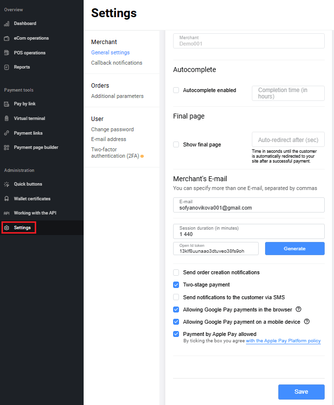 Общи настройки - укажете обща информация за регистрация на поръчка в Платежната врата: