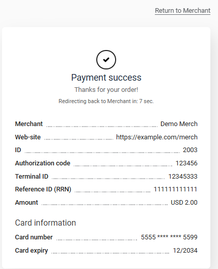 After successfull payment, the client can optionally be redirected to the Final page. This page contains data about the payment and a link back to the store.